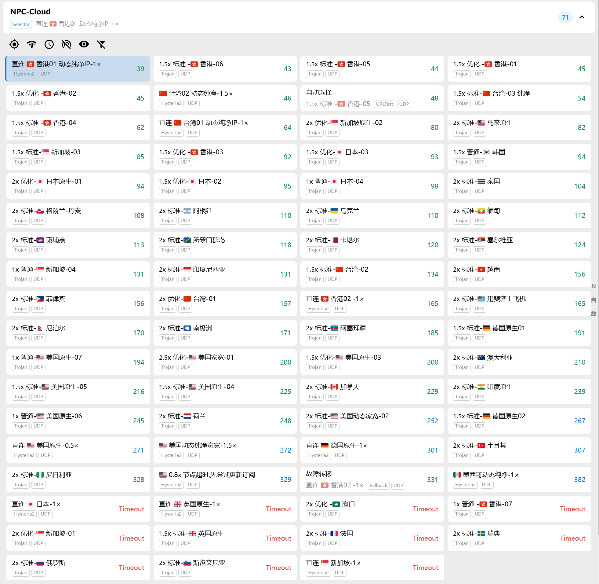 一家较大型中转机场,一个固定电信入口+根据运营商解析的三网BGP入口,目前覆盖全球 30+ 不同地区,70 +节点可选择使用,有便宜的不限时长套餐。注意节点普遍有倍率。