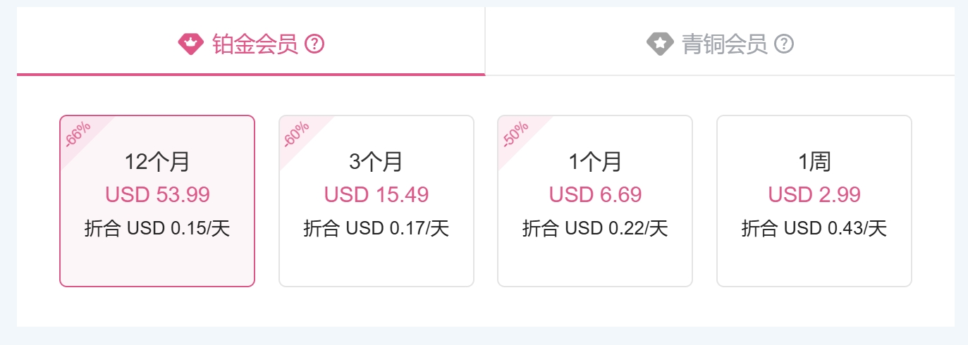 一家速度挺不错的老牌VPN,号称永远能连上的VPN,无任何限制和记录。拥有非常多的落地节点,按时长计费,可以按周购买。每小时可领取免费时长,安装后打开填写推荐码:324347084 可以多得3天会员!铂金会员有全局加速模式和选择任意国家线路的权限,青铜没有。