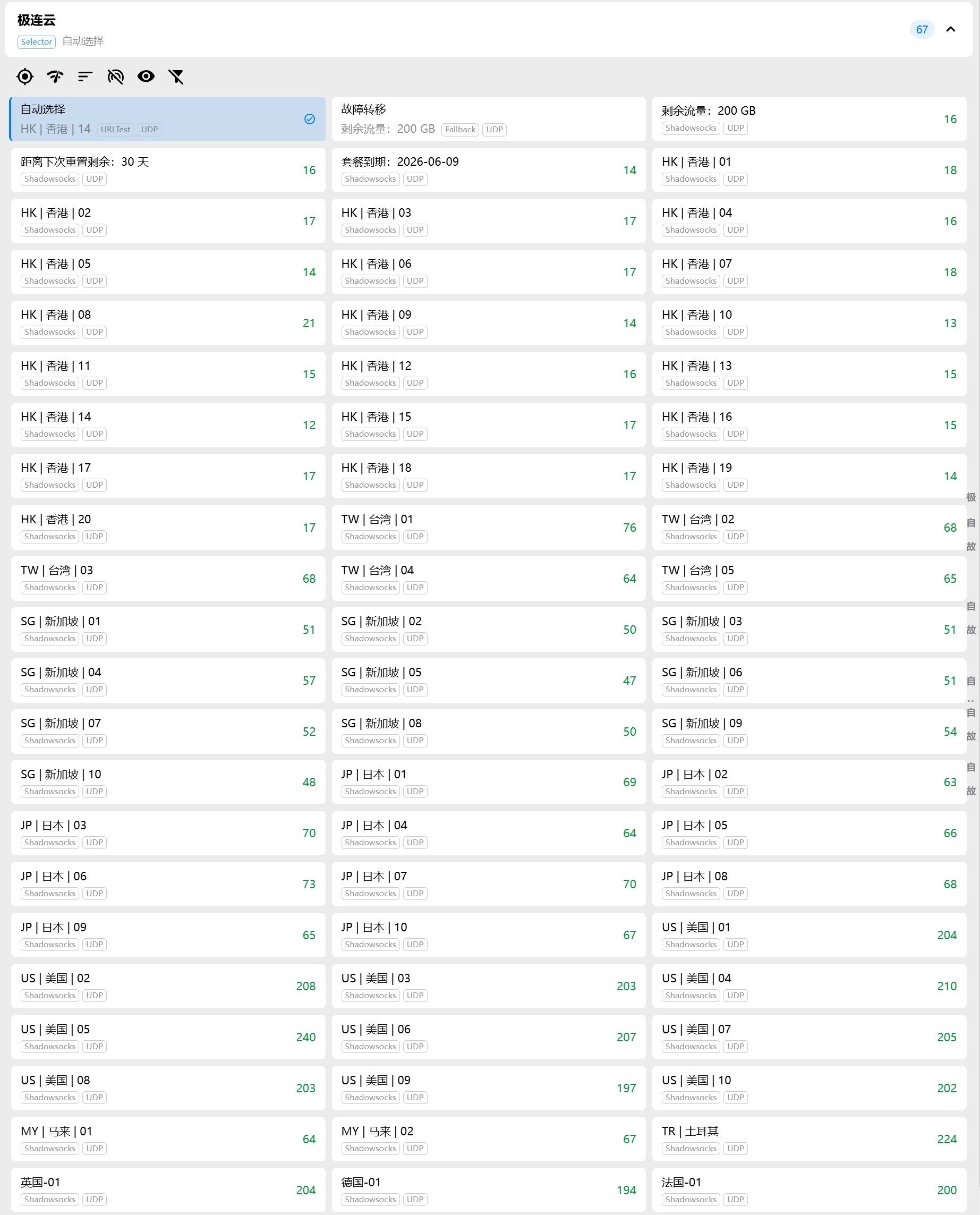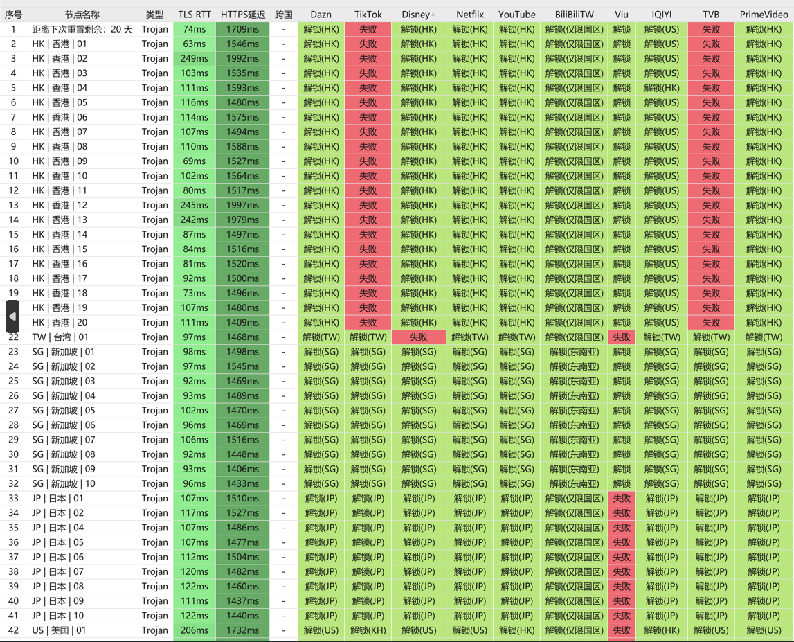 落地节点地区:香港 x20、台湾 x10、日本 x10、新加坡 x10、马来西亚、美国 x10、韩国 x2、越南 x1、菲律宾 x1、泰国 x1、印度 x1、德国 x1、法国 x1、英国 x1、阿根廷 x2