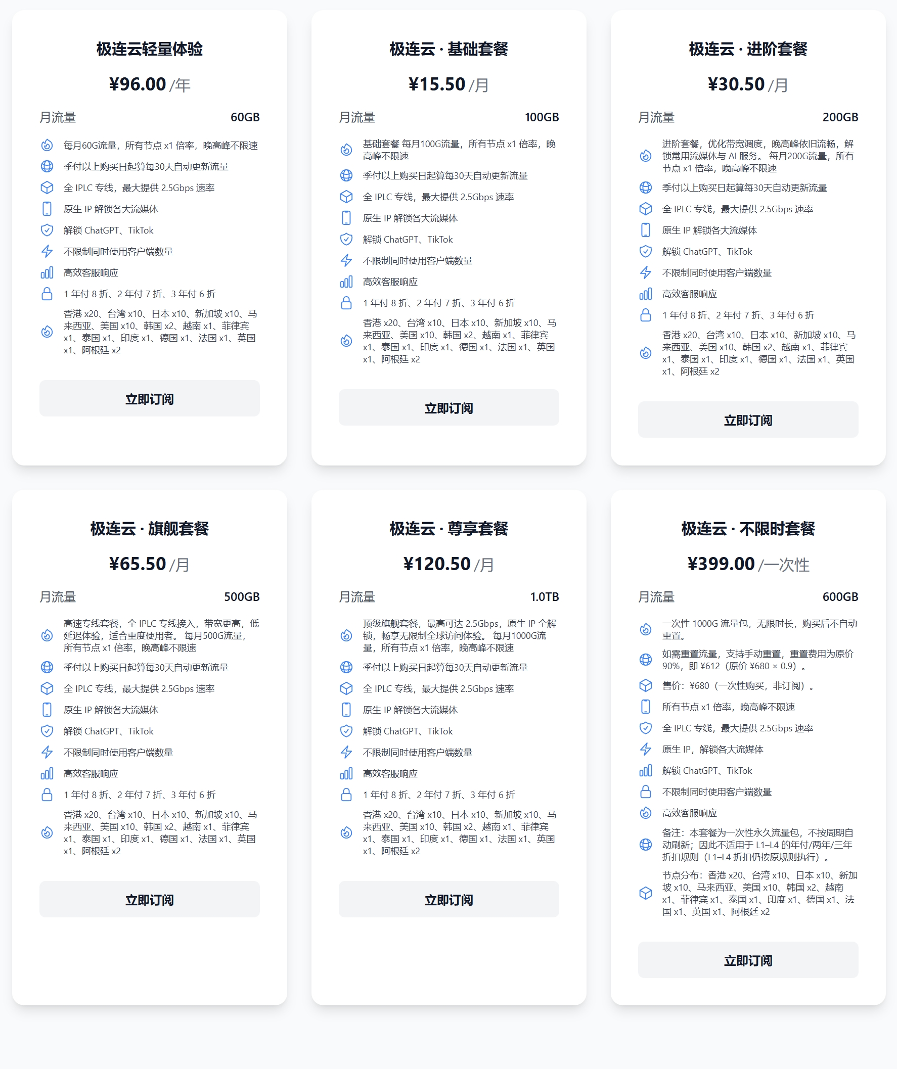 全专线中转,线路延时极低,最大提供 2.5Gbps 速率,晚高峰也有良好表现。所有节点采用原生大机房,原生 IP 解锁各大流媒体,支持电信/移动/联通三网入口,多运营商覆盖,提升三网用户的连接质量。不限制同时使用客户端数量。