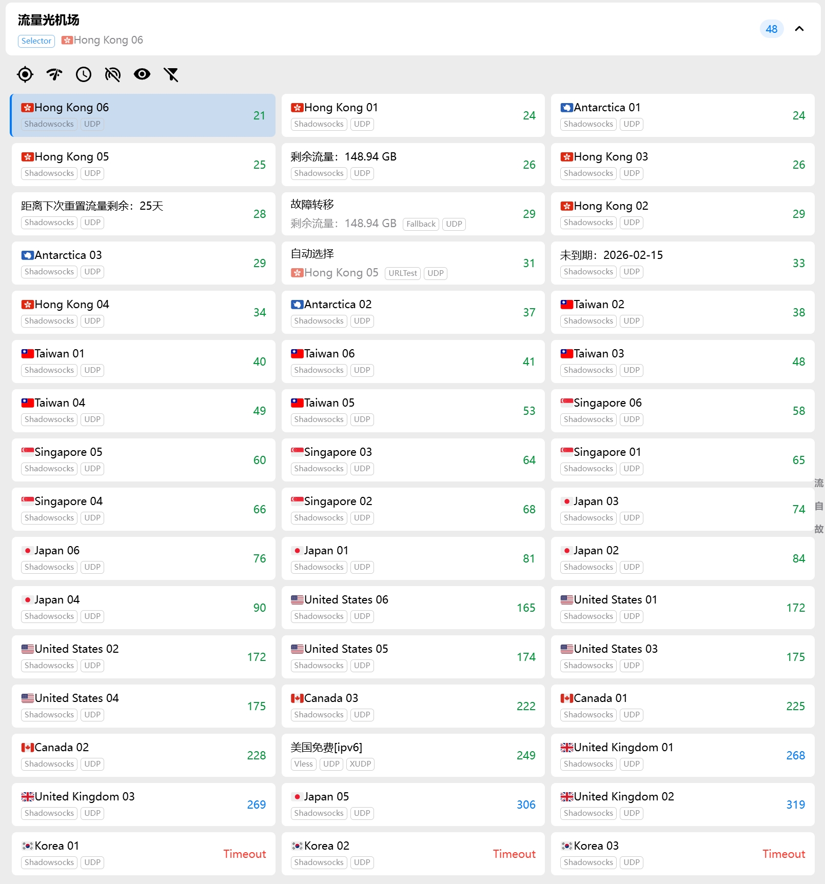 落地节点地区:香港、台湾、日本、美国、新加坡、韩国、澳大利亚、南极洲、朝鲜
