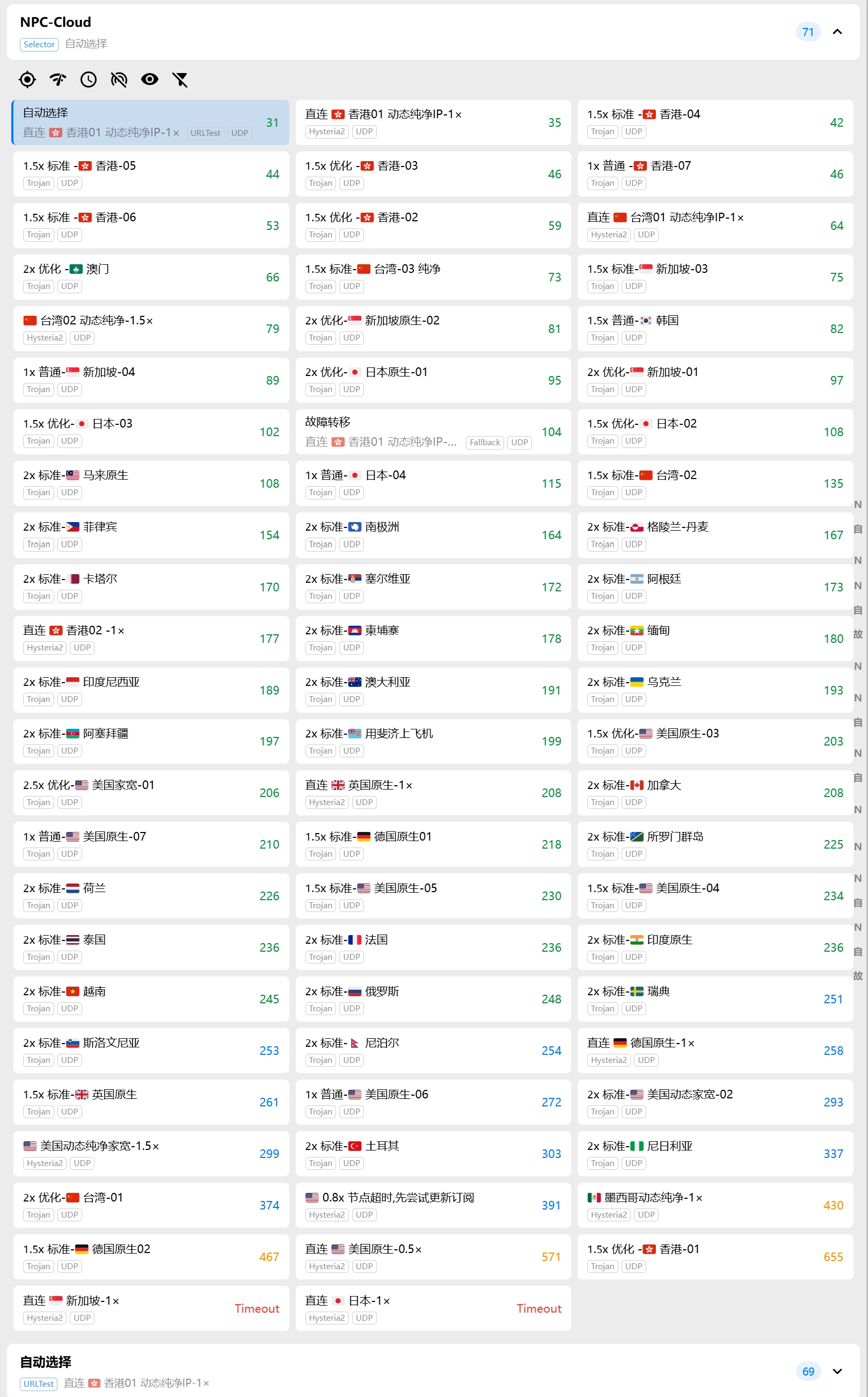 一家较大型中转机场,一个固定电信入口+根据运营商解析的三网BGP入口,目前覆盖全球 30+ 不同地区,70 +节点可选择使用,有便宜的不限时长套餐。注意节点普遍有倍率。